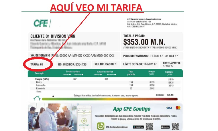 Para verificar si su empresa, planta procesadora o fábrica debe cumplir con esta regulación, ubique la Tarifa en el recibo de consumo de Energía Eléctrica, como se muestra en la imagen.